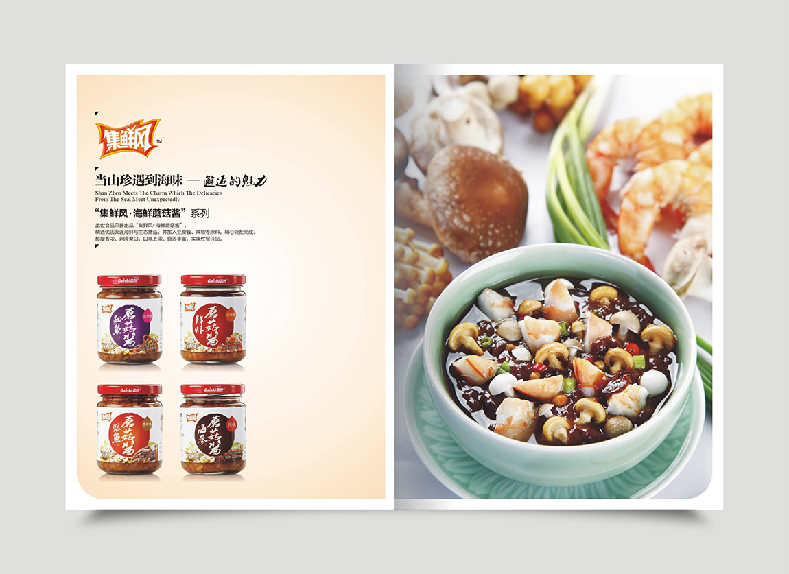 盖世食品下的子品牌,其特色是海鲜与菇的搭配,重点是突出鲜。采用明快、清爽的颜色,以给人鲜爽的感觉。