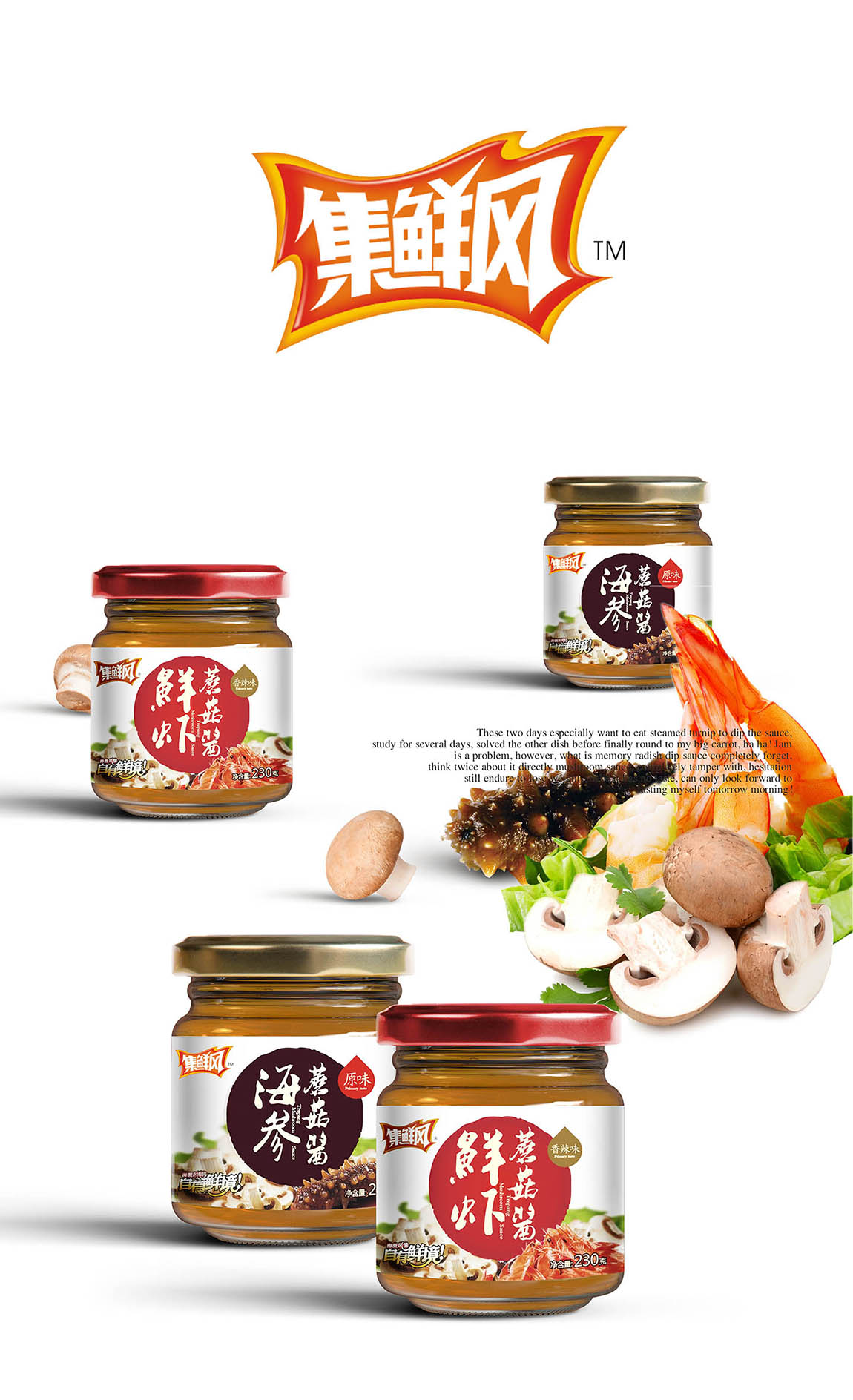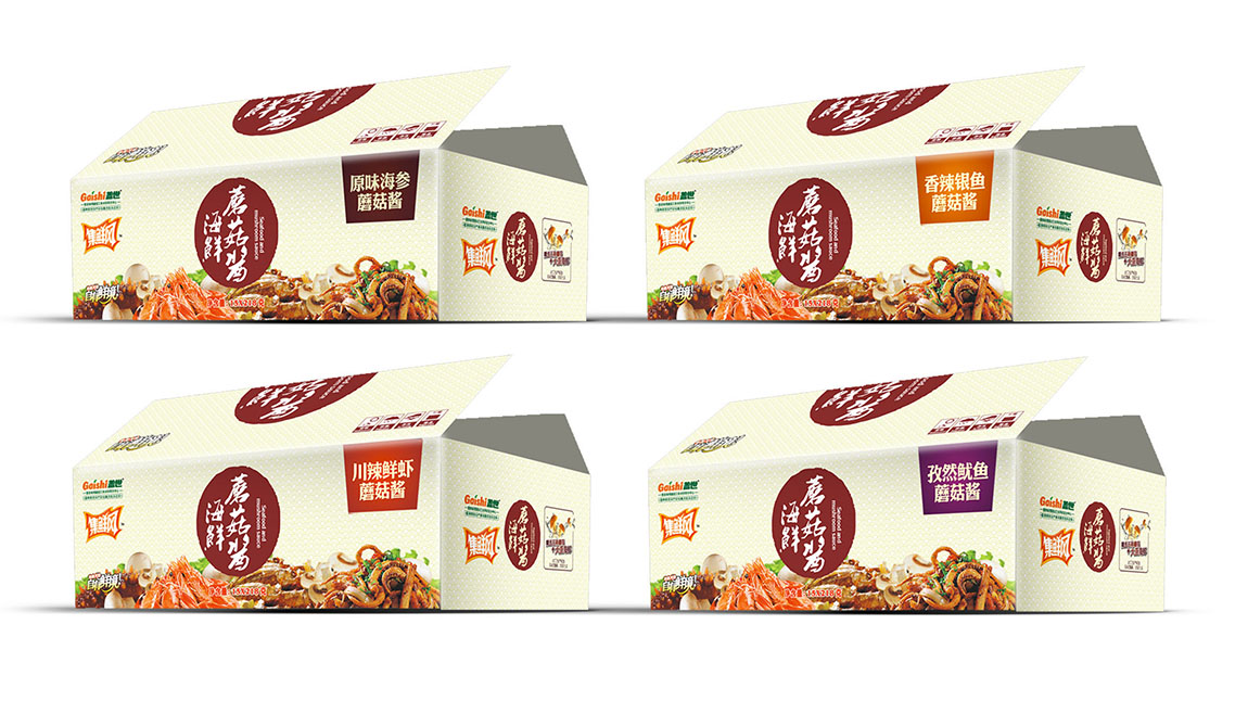 盖世食品下的子品牌,其特色是海鲜与菇的搭配,重点是突出鲜。采用明快、清爽的颜色,以给人鲜爽的感觉。